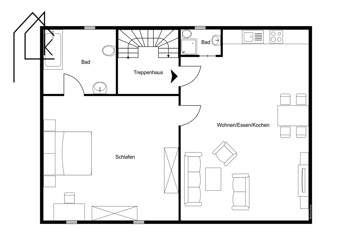 Die Raumaufteilung umfasst einen offenen Wohn- und Essbereich mit integrierter Küche, ein Schlafzimmer, ein Tageslichtbad sowie ein separates Gäste-WC.